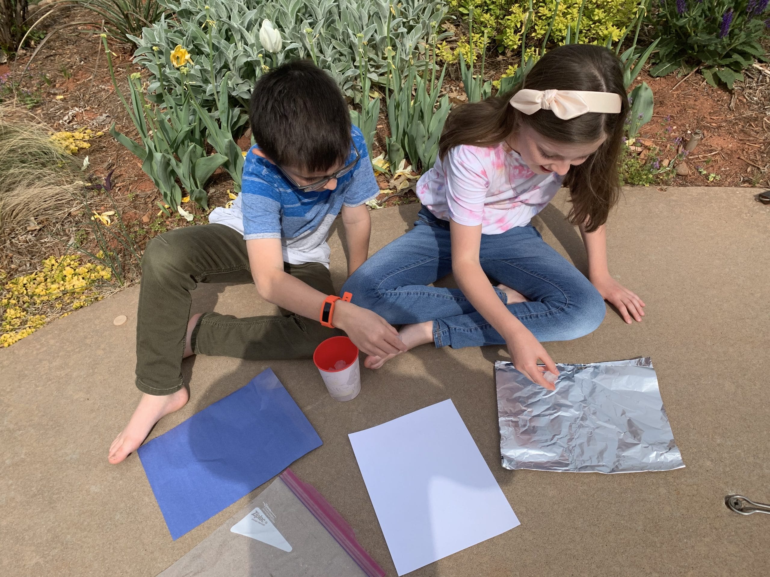 - Place each surface outside with one ice cube on top. Start your timer or your stopwatch.
