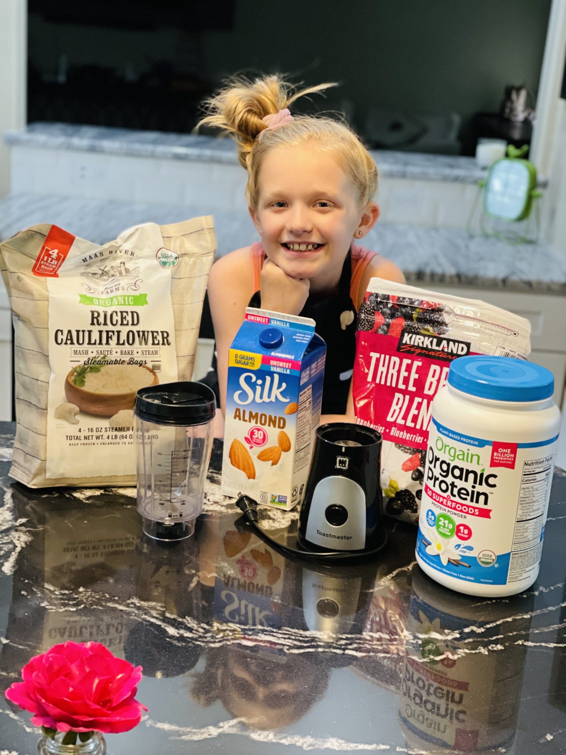 “I put frozen cauliflower rice in it because it makes it fluffier,” said Kinley. “It’s almost like ice cream! You can drink it in a cup, eat it out of a bowl with a spoon or put strawberries, bananas or granola