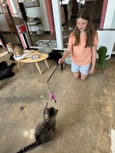 Mental wellness is an added benefit for the human visitors and a top priority for owner Michaela Fitzpatrick, a licensed clinical social worker who operates a private counseling practice. In the middle of a wild work week, I could literally feel the tension leave my body as my daughter and I giggled at playful kitty antics and petted our new feline friends. Some of the cats wanted to play with the toys and laser pointers, others were content to nap and still others just wanted to be loved on.