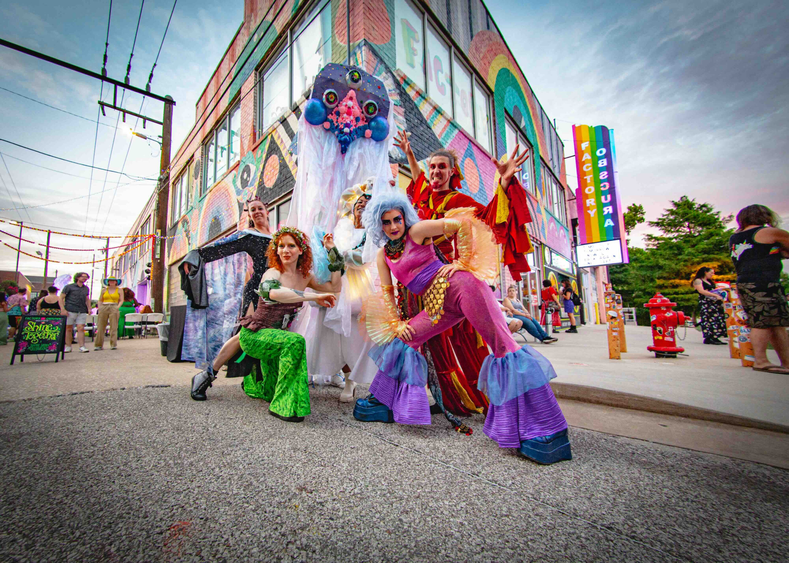 Features interactive collaborative performance, a neighborhood frolic and community movement.