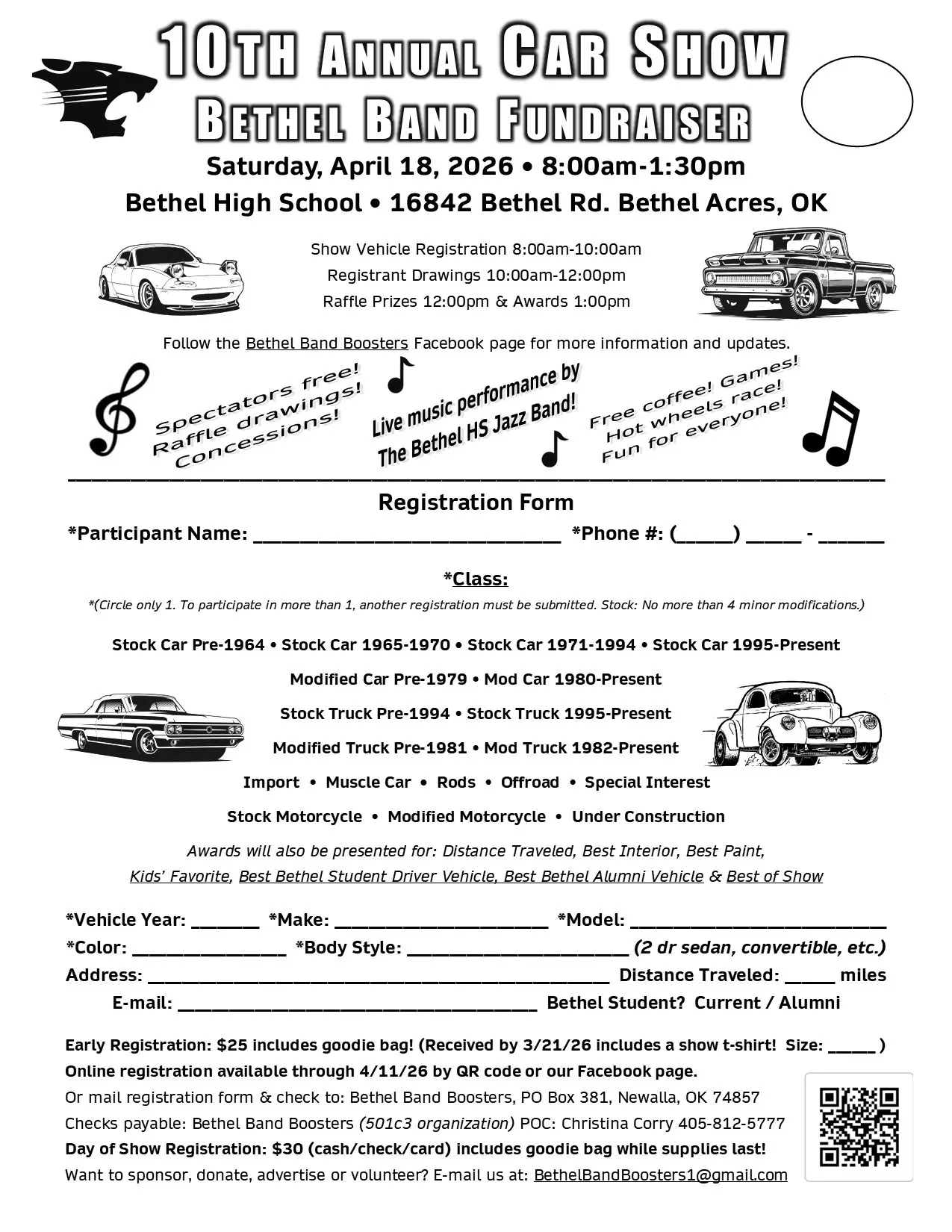Features various classes of vehicles, plus music, activities for kids, concessions, door prizes, raffles, and a live performance by the award-winning Bethel High School Jazz Band!