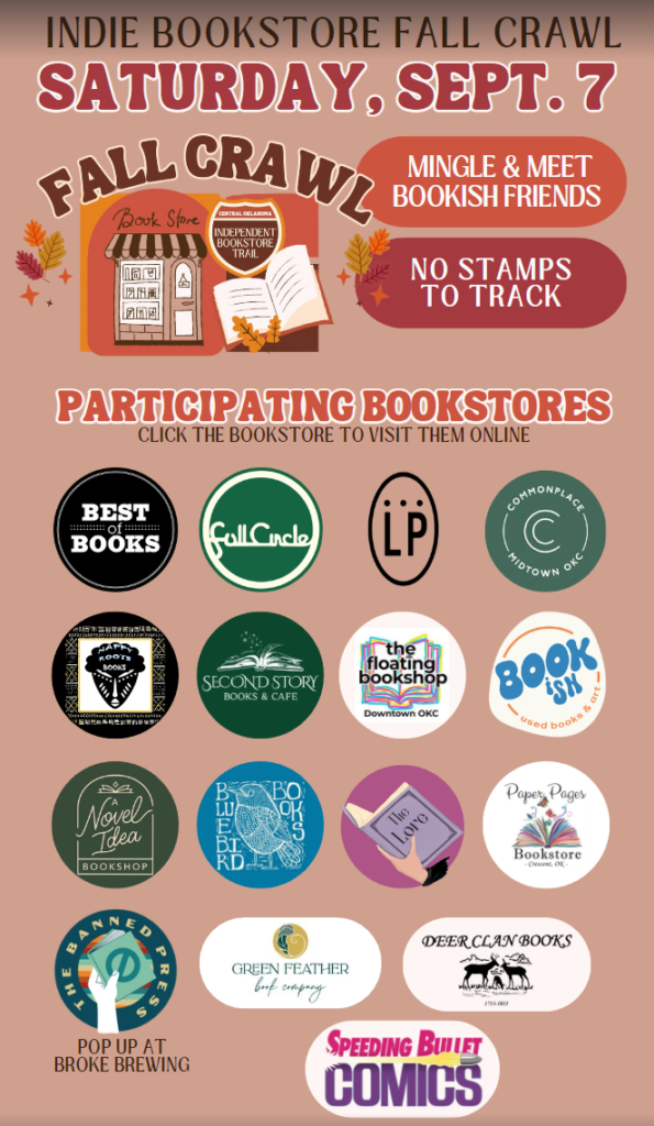 This cozy crawl invites readers to visit their favorite bookstores from Edmond to OKC, Guthrie to Norman, Crescent to Bethany and everywhere in between. Mingle and meet up with book friends, shop local, and pick up a new book or two.