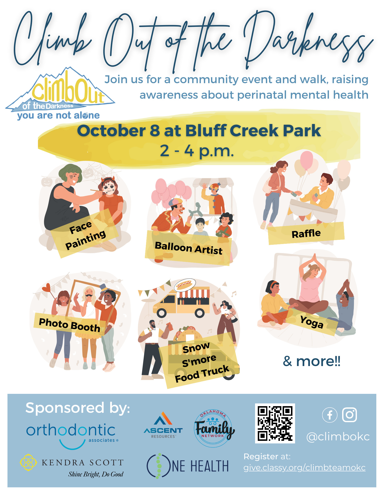 Climb Out of the Darkness brings communities together to shine a light on perinatal mood and anxiety disorders. PMADs are disorders such as postpartum depression and anxiety, the most common pregnancy and childbirth complication. The goal of the CLIMB Out of the Darkness OKC is for survivors, providers and community members to come together to share stories of hope, celebrate recovery, and shine a light on the darkness.