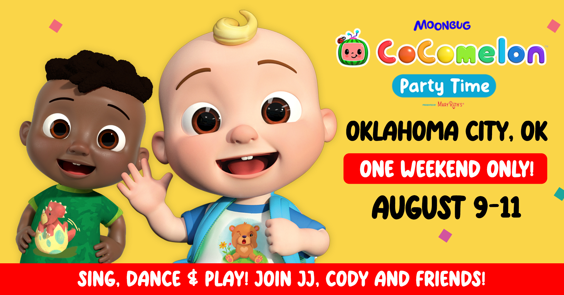 Dance, sing and play with JJ, Cody and friends. An immersive experience takes you inside the colorful world of CoComelon where children can explore their way through a variety of interactive party experiences. Play games in the Cuddly Corner, get creative in an activity & coloring center, Dance on a light-up dance floor and more.