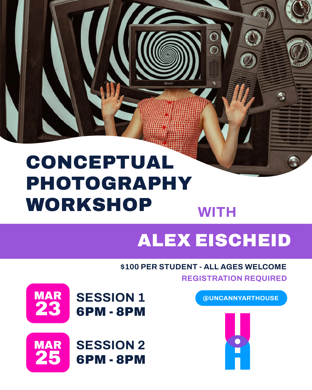 This two-session workshop explores how strong photographic ideas are formed and translated into finished images. Led by Alex Eischeid, Uncanny Art House’s exhibiting artist for the month of March, the class focuses on concept-driven photography rather than technical instruction alone.