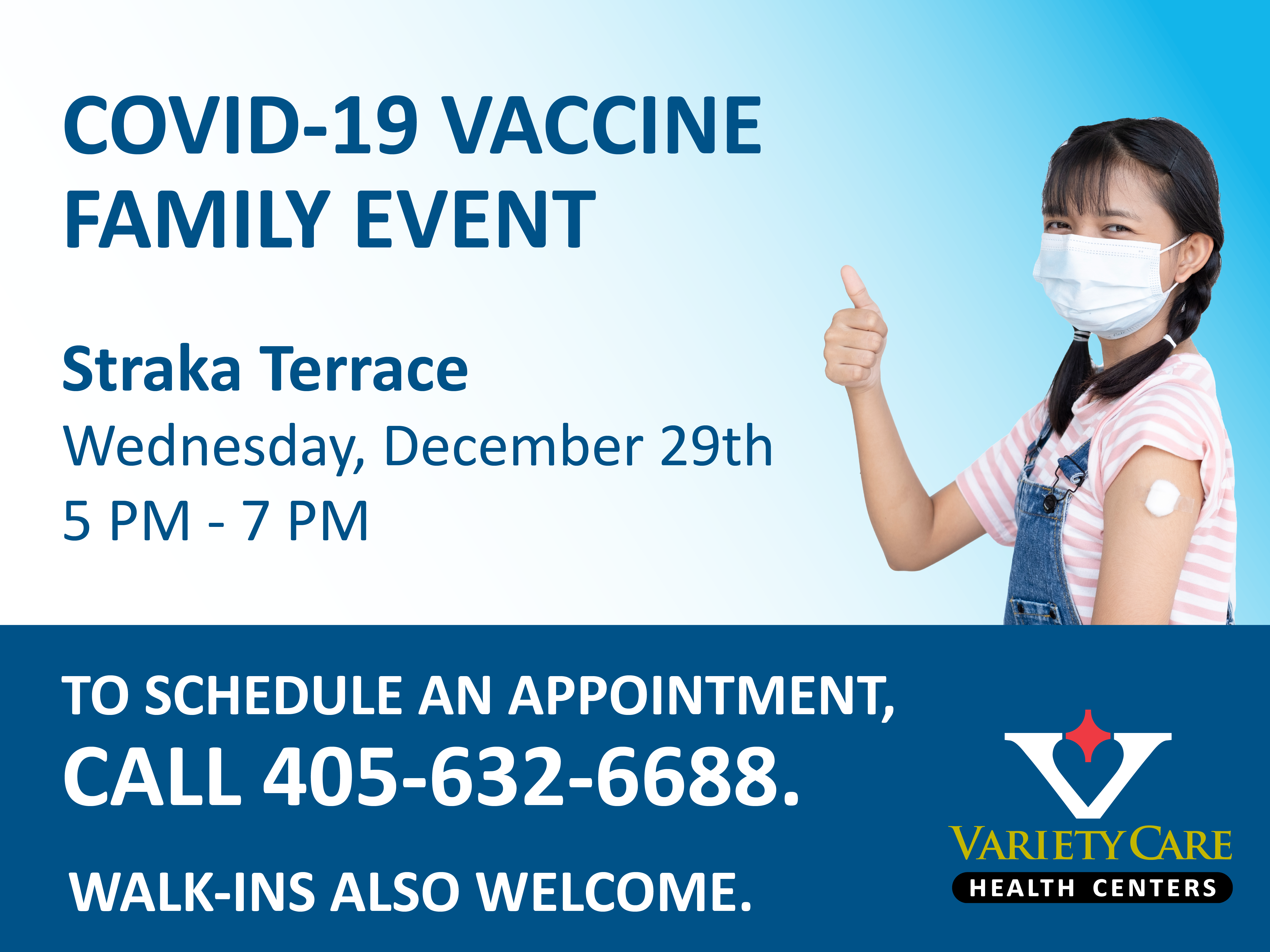 To schedule an appointment, call 405-632-6688. Walk-ins are also welcome. To learn more about the vaccine events, visit varietycare.org/covid/covid19vaccines.