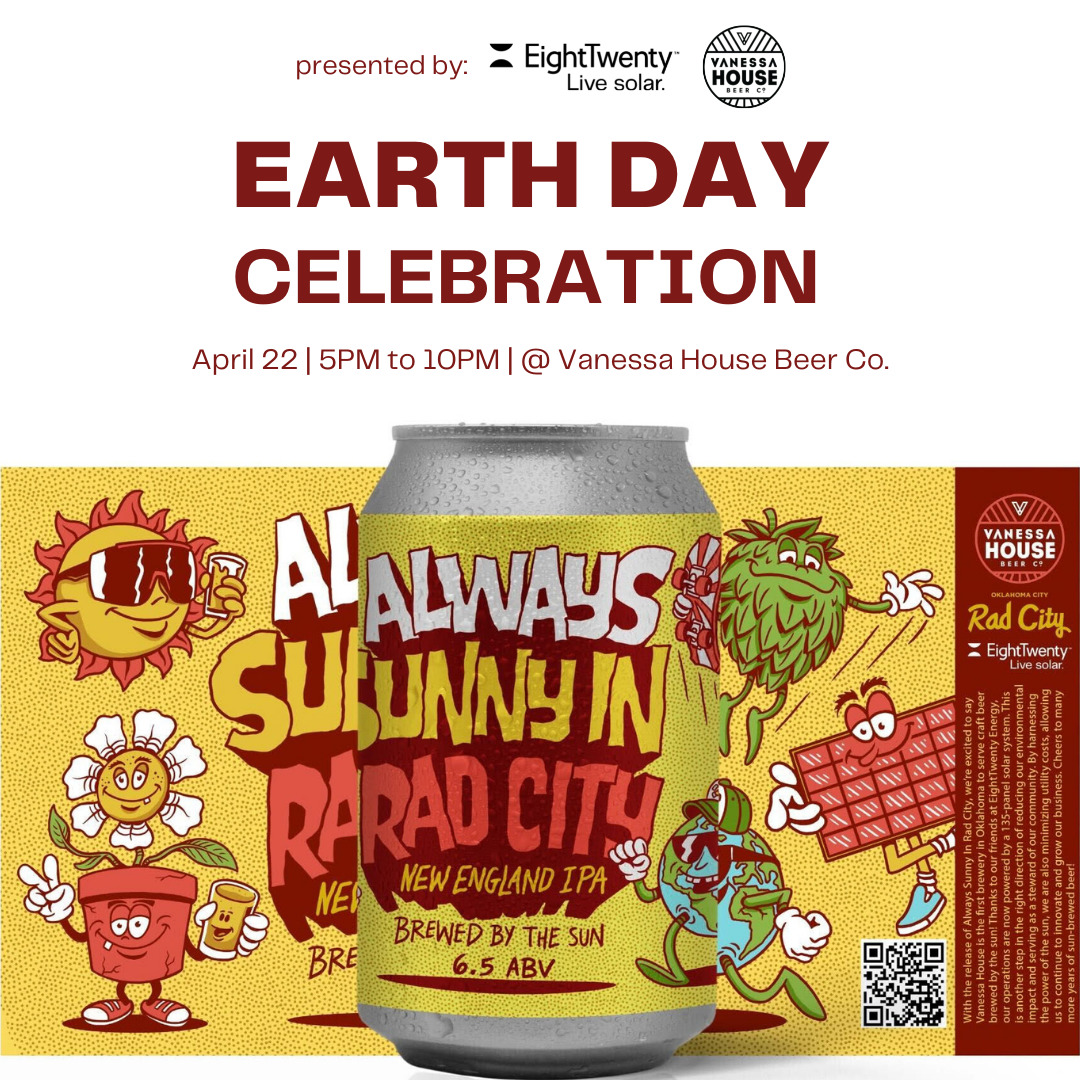 EightTwenty Energy and Vanessa House Beer Co. are joining together to launch the brewery's first batch of sun-brewed beer at an Earth Day celebration. The family-friendly event will include Earth Day pop-ups celebrating sustainability in Oklahoma from 5-7:30 p.m. and live music by Beau Jennings starting at 8:30 p.m.