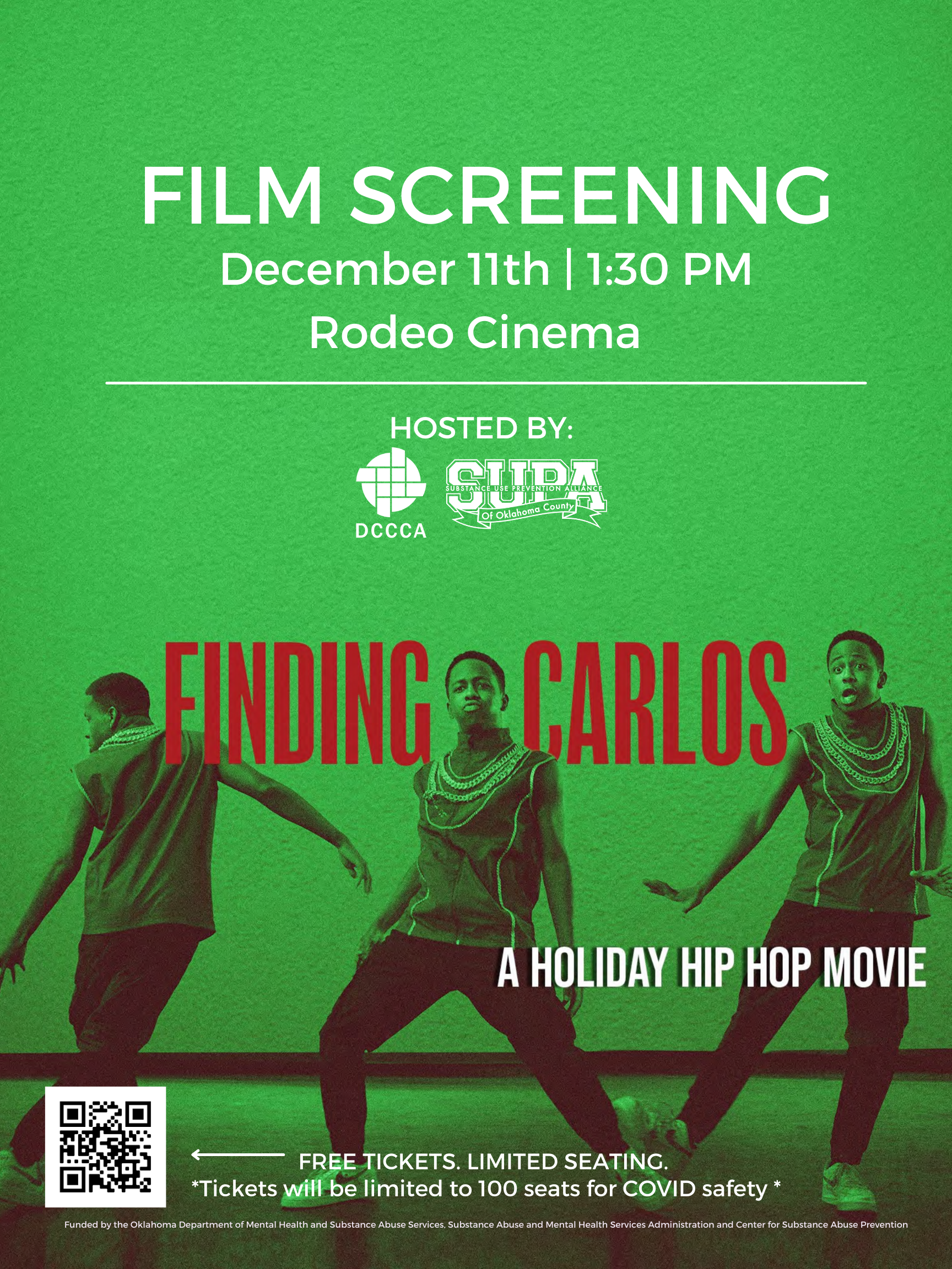 Features a free movie screening for the film Finding Carlos. Finding Carlos is a holiday hip hop movie that is locally made in OKC and is inspired by the classic story ballet “The Nutcracker.” The film focuses on substance use prevention through the eyes of a teenager trying to adapt to life challenges.