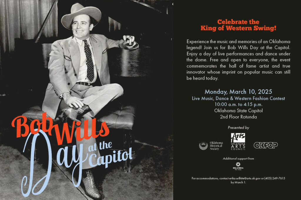 Features live music performances by Western swing musicians throughout the day, plus a Western fashion contest. Attendees are invited to come dressed in their Western attire for the chance to earn prizes in categories including boots, shirts, ties (bolo/bow), and Western swing skirts. Embellishments such as embroidery are encouraged. Prizes for the contest are being provided by the Oklahoma Film & Music Office.