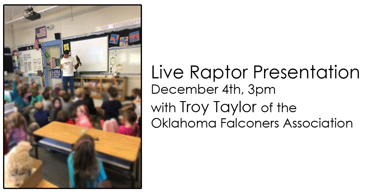 Features free presentation to learn more about some fascinating birds of prey. Experienced falconer Troy Taylor will be teaching interesting raptor facts, ways we can help with conservation efforts for these amazing birds, and will even introduce us to a few of his raptor friends.