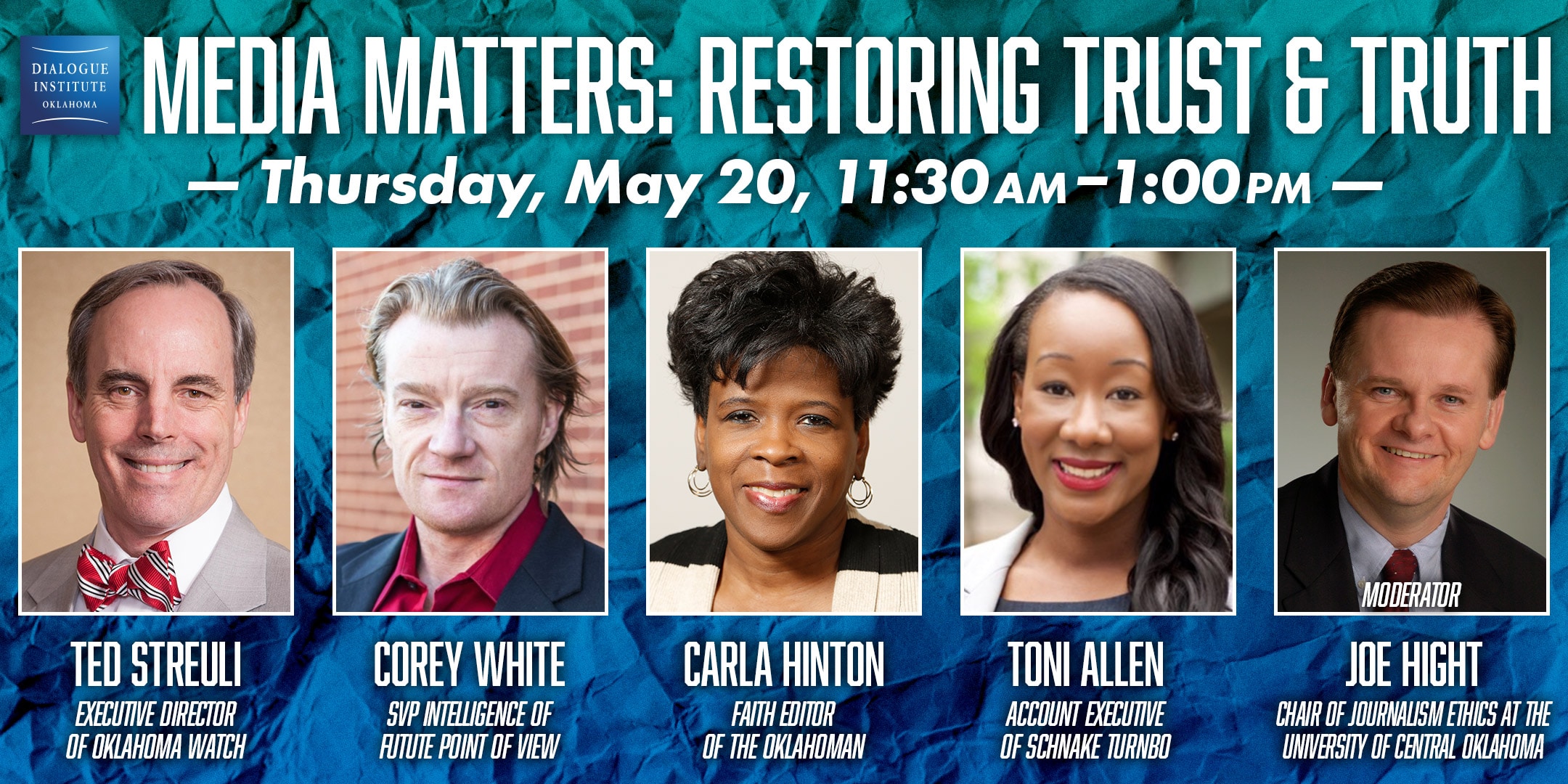The virtual event will explore, among others, issues concerning bias, censorship and civility. The panelists include Oklahoma Watch’s Executive Director, Ted Streuli; The Oklahoman’s Faith Editor, Carla Hinton; Future Point of View’s SVP of Intelligence, Corey White; and Schnake Turnbo’s Account Executive, Toni Allen. The panel will be moderated by Joe Hight, Chair of Journalism Ethics at the University of Central Oklahoma.