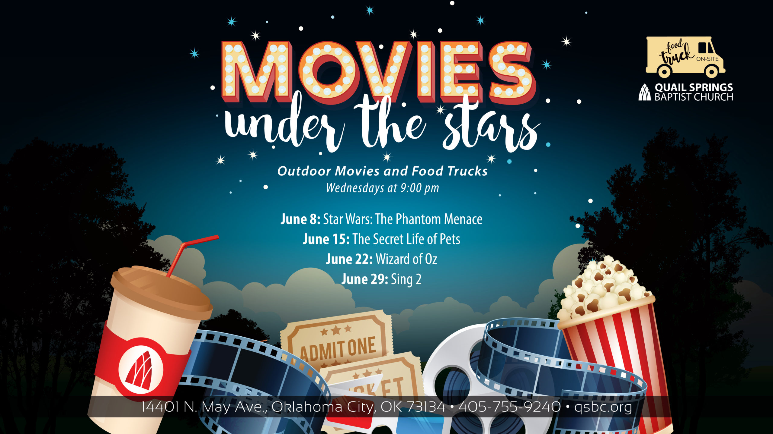 Features family-friendly outdoor movies and food trucks at Quail Springs Baptist Church Wednesdays in June. Bring your lawn chairs and blankets and enjoy a movie under the stars.