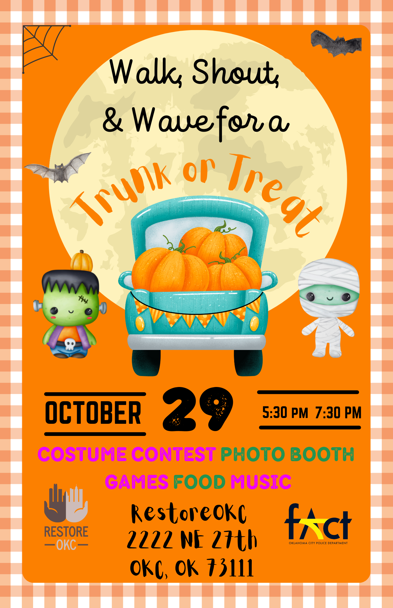 Features a family-friendly evening with music, costume contest, photo booth, light dinner and trunk-or-treating.