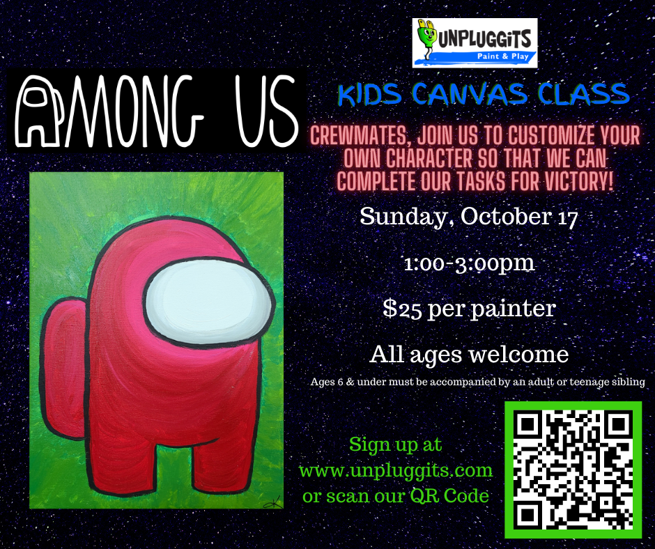 Features an instructor-led, step-by-step canvas painting class. October's activity will be Among Us Characters