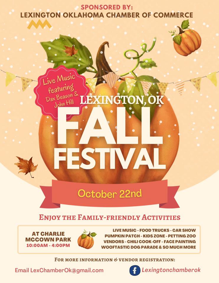 Features live music, chili cookoff, car show, petting zoo, dog parade, kids zone, food trucks, craft vendors and a pumpkin patch.