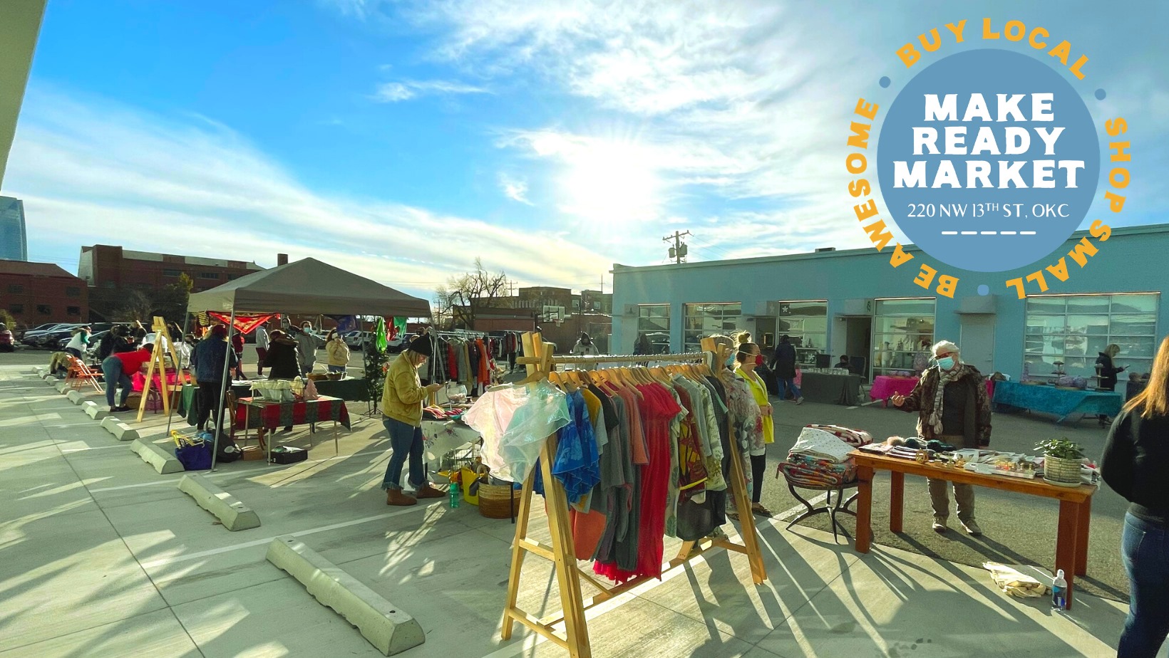 Features an outdoor market with an assortment of locally made goods, including clothing, flowers, skin care products, vintage, jewelry, art, pottery, food.