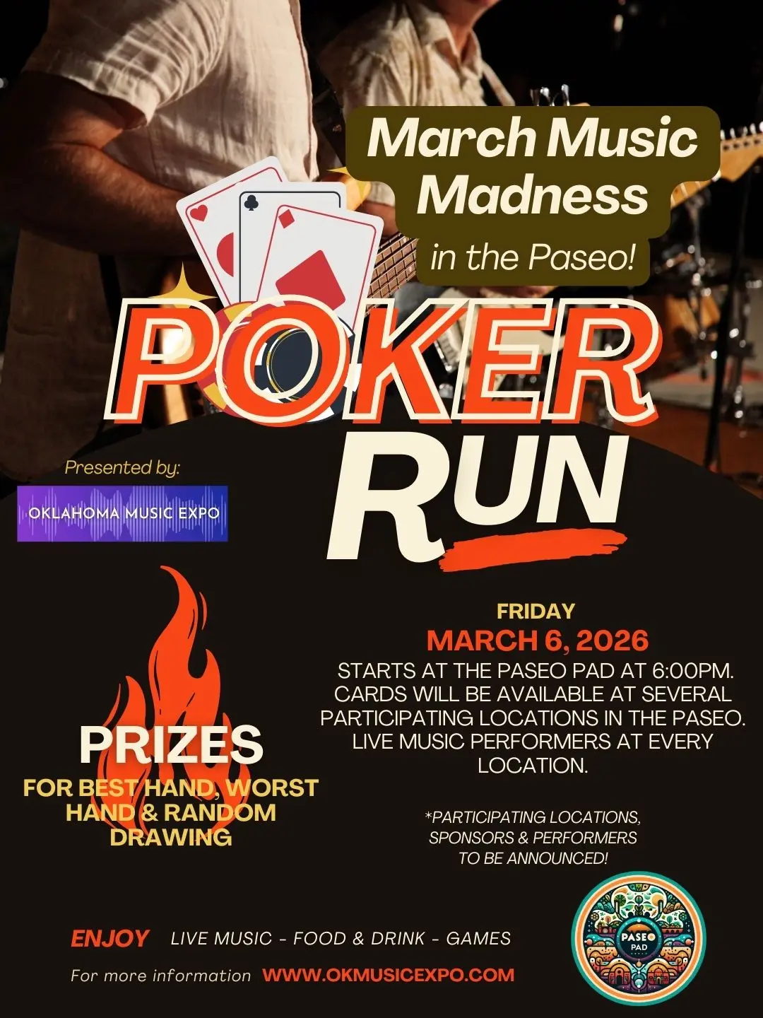 Join us for March Music Madness in the Paseo, presented by the Oklahoma Music Expo. There will be live music hosted by five different locations throughout the district. Participants will start at registration at the Paseo Pad (533 NW 30th St, OKC) and make their way to four other participating businesses in the district, collecting cards for a chance to win one of three prize sets! Registration is $15 in advance and $20 at the door. Every participant receives a free t-shirt. There are only 104 spots available! Sign up today to secure your spot! This is an all-ages, family friendly event. Entry to all performance locations is free. There is no charge to enjoy the music and have a good time!