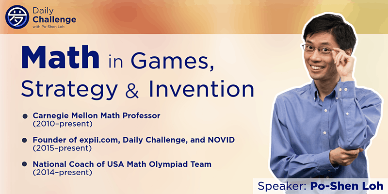 Co-hosted by Daily Challenge with Po-Shen Loh and Share&Grow, this fun and interactive math event is meant for students who will be in Grades 5–8 next school year, together with their families. It will discuss some games which appear simple at first glance, but turn out to have powerful strategies that become visible after changing to a mathematical perspective.