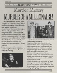Guests will gather for the funeral service of Oklahoma Oil King, Assaph “Ace” Gutowsky, but all is not what it seems. As the evening unfolds, attendees will search for clues, solve puzzles and work together to crack the case of who wanted Ace dead… and why. Guests are encouraged to arrive dressed in period-inspired attire from the 1930s–40s or wear black in mourning for the late millionaire.