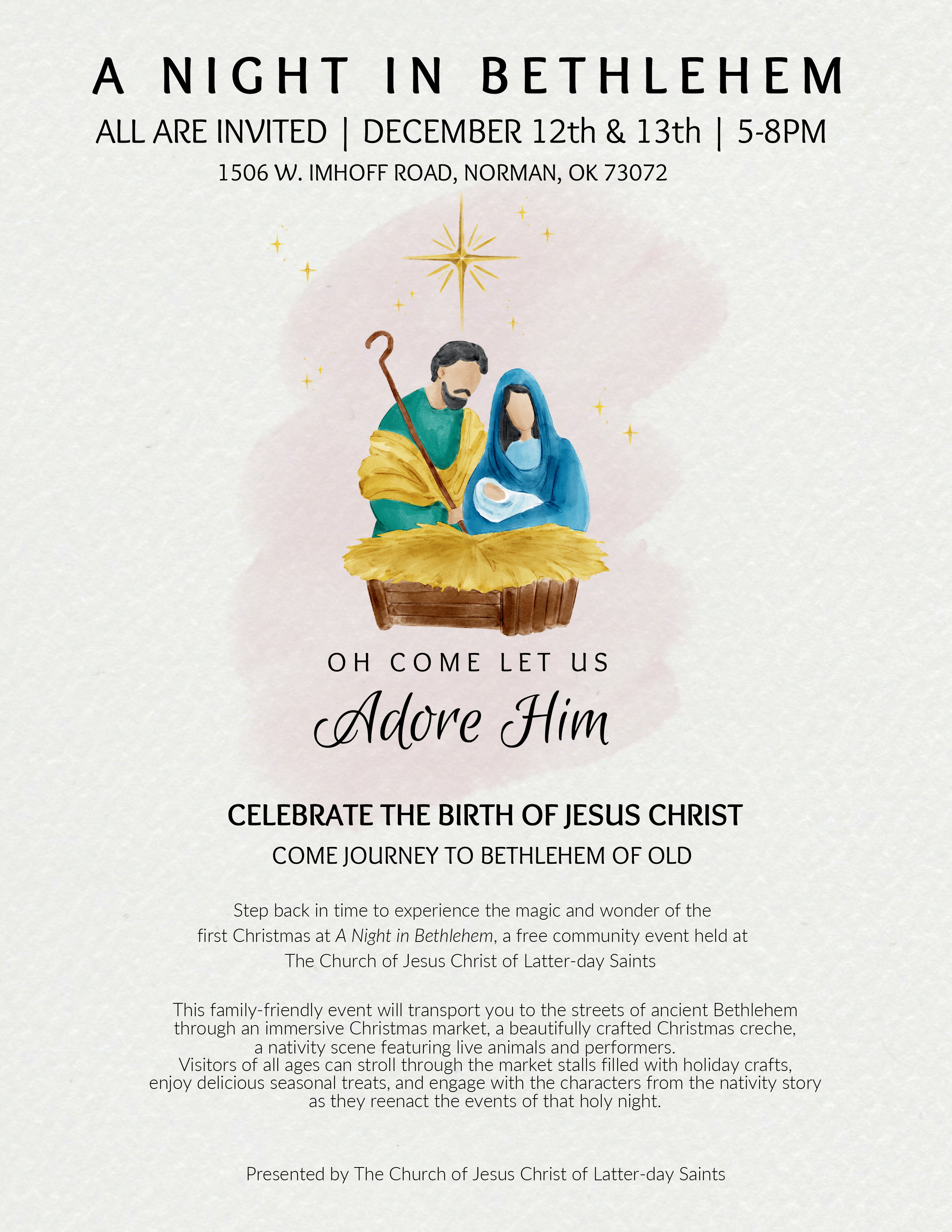 This family-friendly event will transport you to the streets of ancient Bethlehem through an immersive experience, a beautifully crafted Christmas creche and a live nativity scene featuring live animals. Visitors of all ages can stroll through the market stalls and make holiday crafts, enjoy delicious seasonal treats, and engage with the characters from the nativity story as they reenact the events of that holy night.