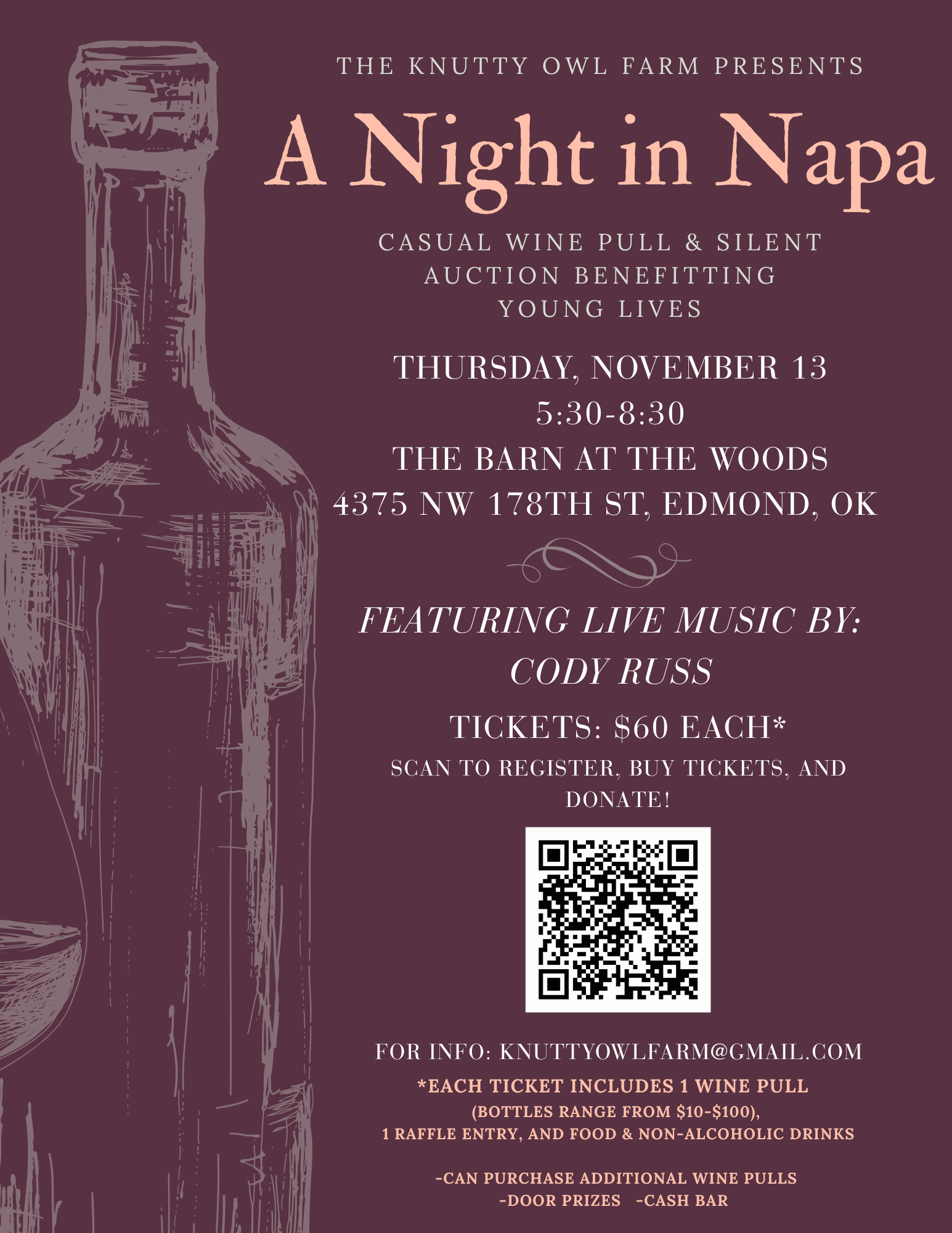 Ticket options include $60 per ticket (includes 1 wine pull, food, music, raffle ticket) or $45 per ticket (all but the wine pull).