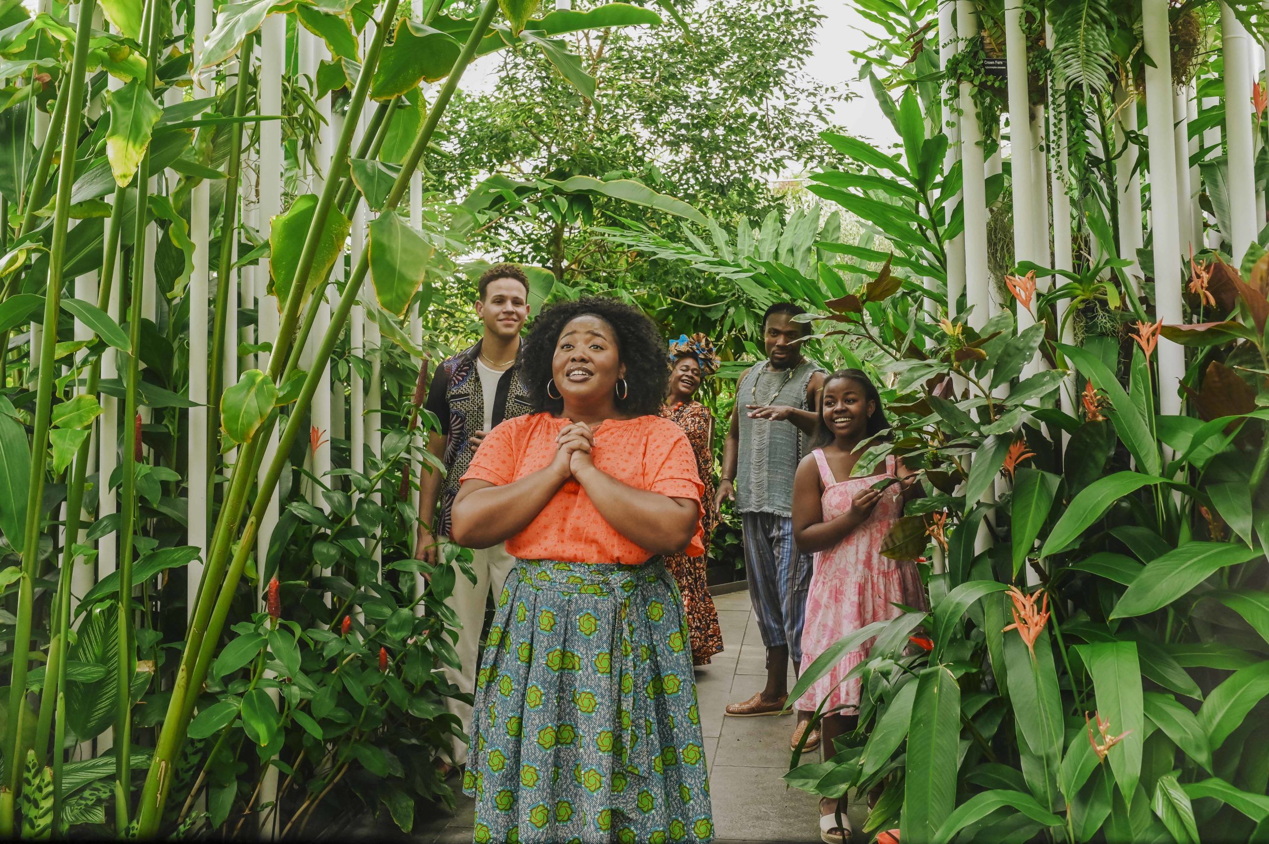 Photo - Kalen Robinson as Ti Moune, Bryce Williams as Daniel, Delanie Phillips-Brewer as Mama Euralie, Isaiah Bailey as Agwe and Nicole Kimani as Little Ti Moune. Taken at Myriad Botanical Gardens and the Inasmuch Foundation Crystal Bridge Conservatory, Oklahoma City, Ok. By Jeffrey Meek Photograph: K. Talley Photography