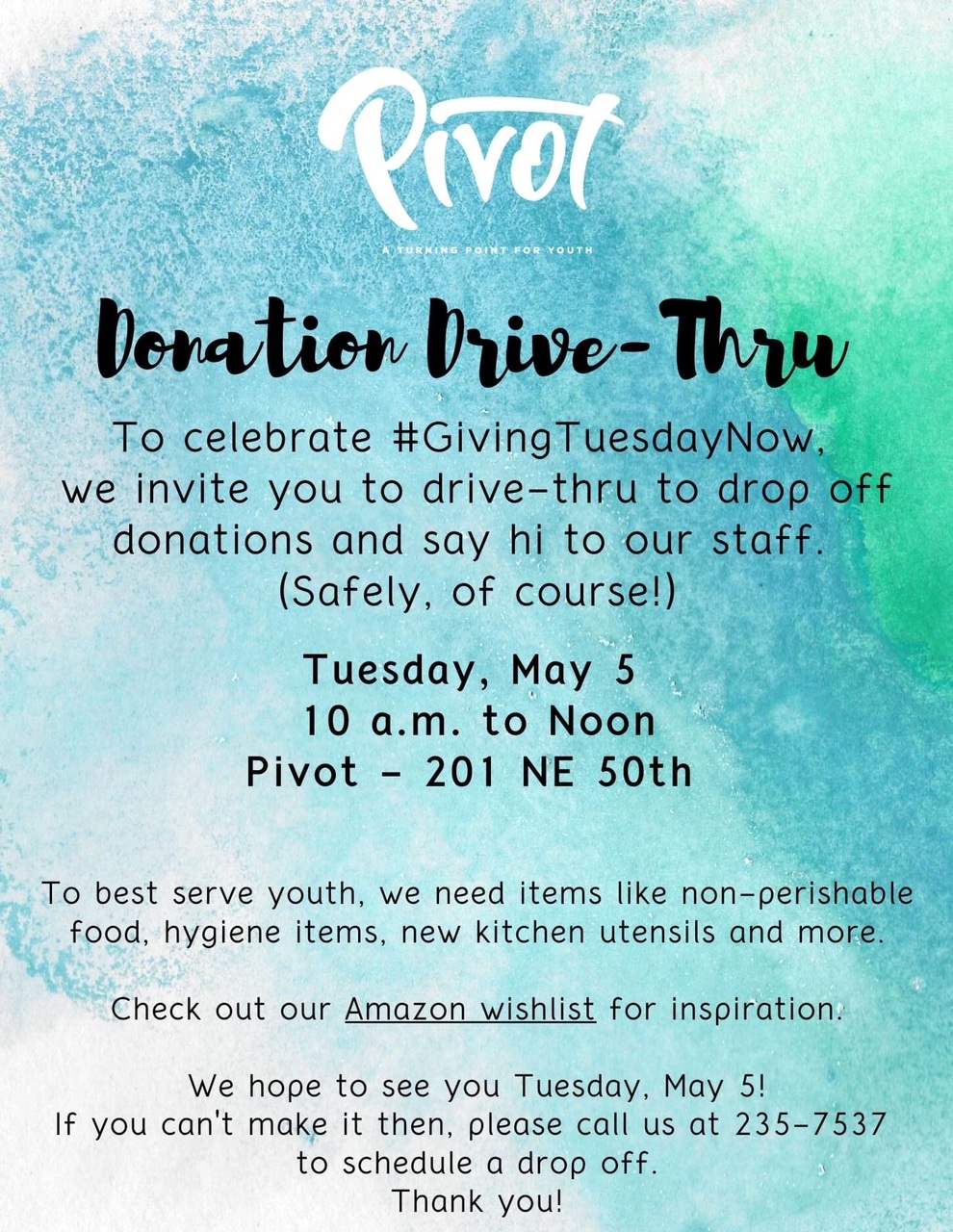 You and your family can drive-thru Tuesday, May 5 from 10 a.m. - noon and hand off donated items to staff that are masked and gloved.