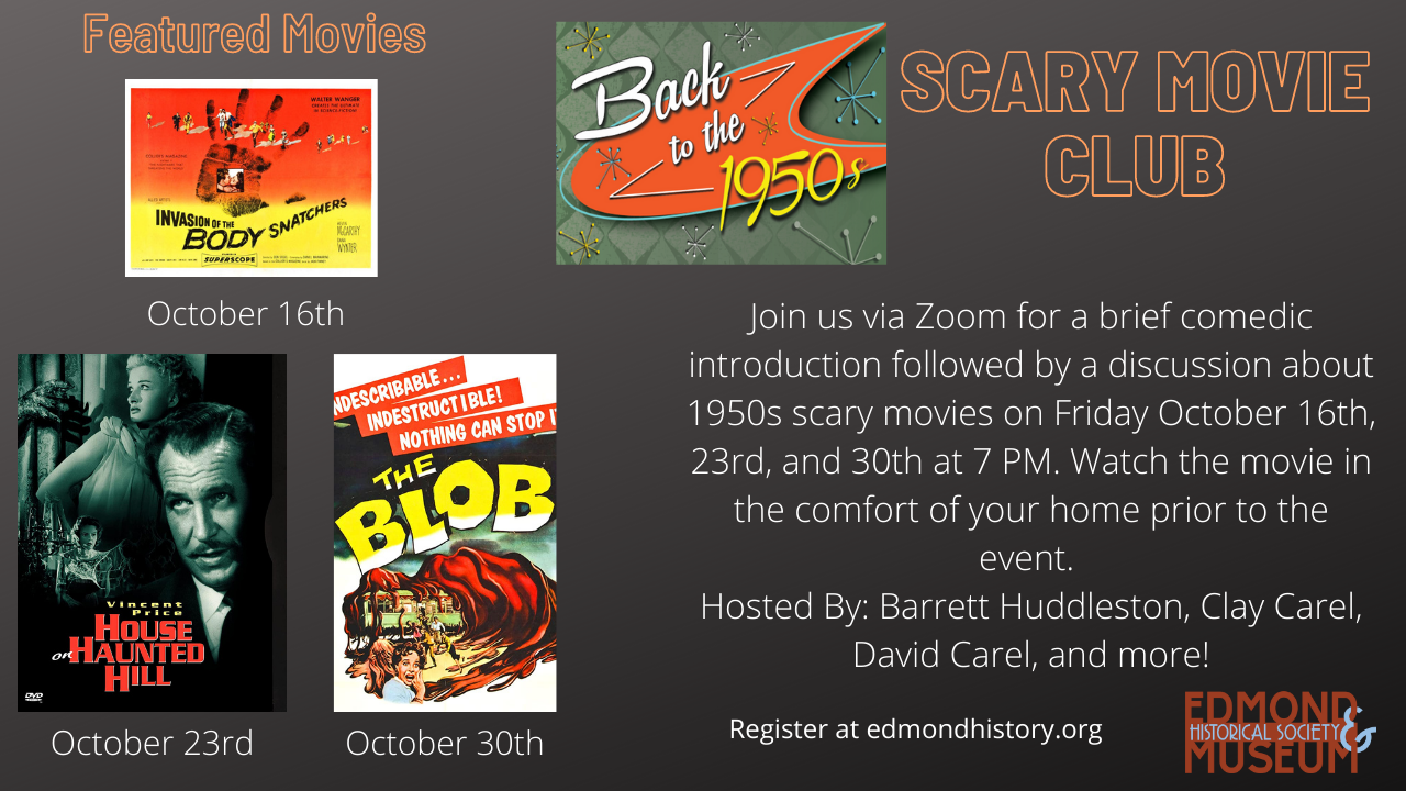 Features a brief comedic introduction followed by a discussion about 1950s scary movies. This event is hosted by Barrett Huddleston, Clay Carel and David Carel.