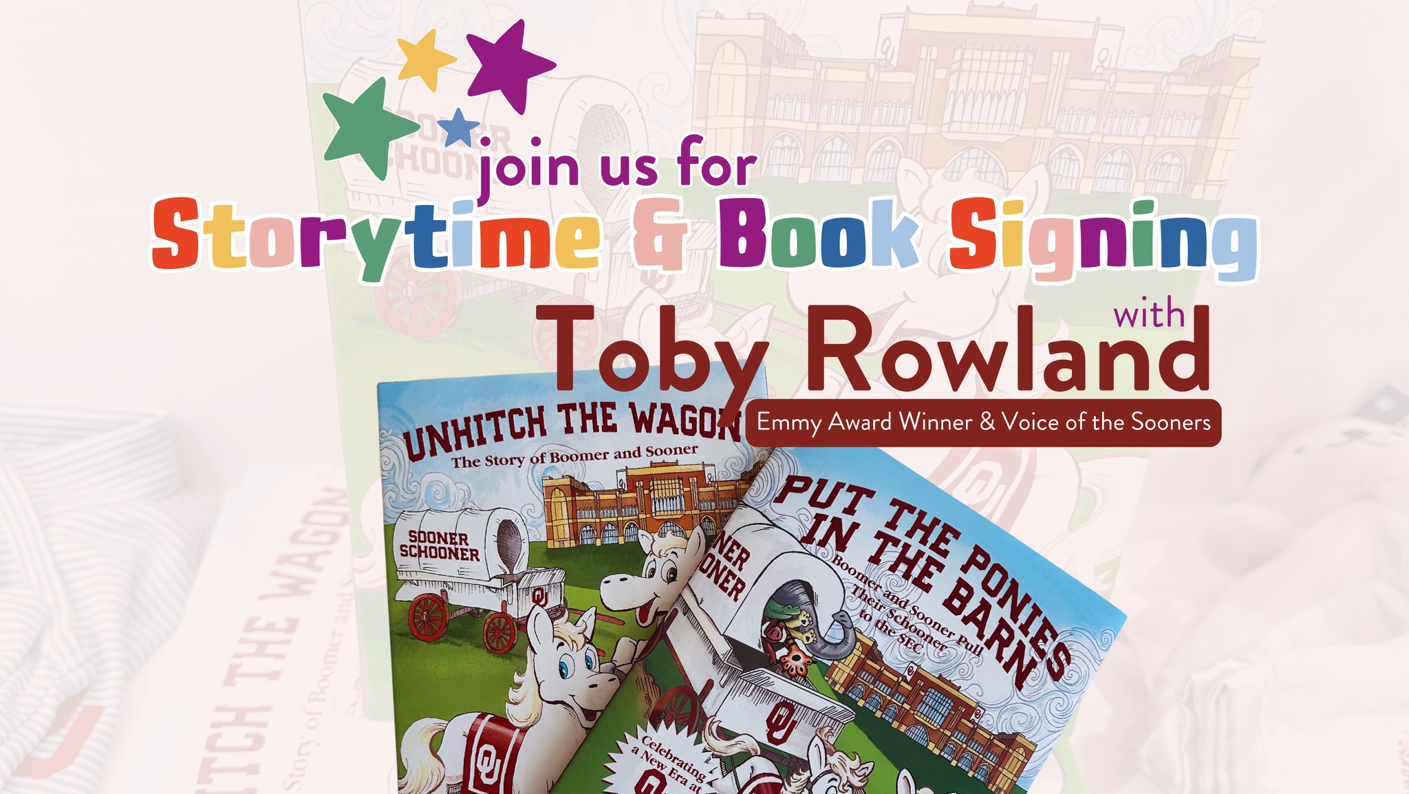 Features storytime and a book signing with Toby Rowland - Emmy award winner & Voice of the Sooners.
