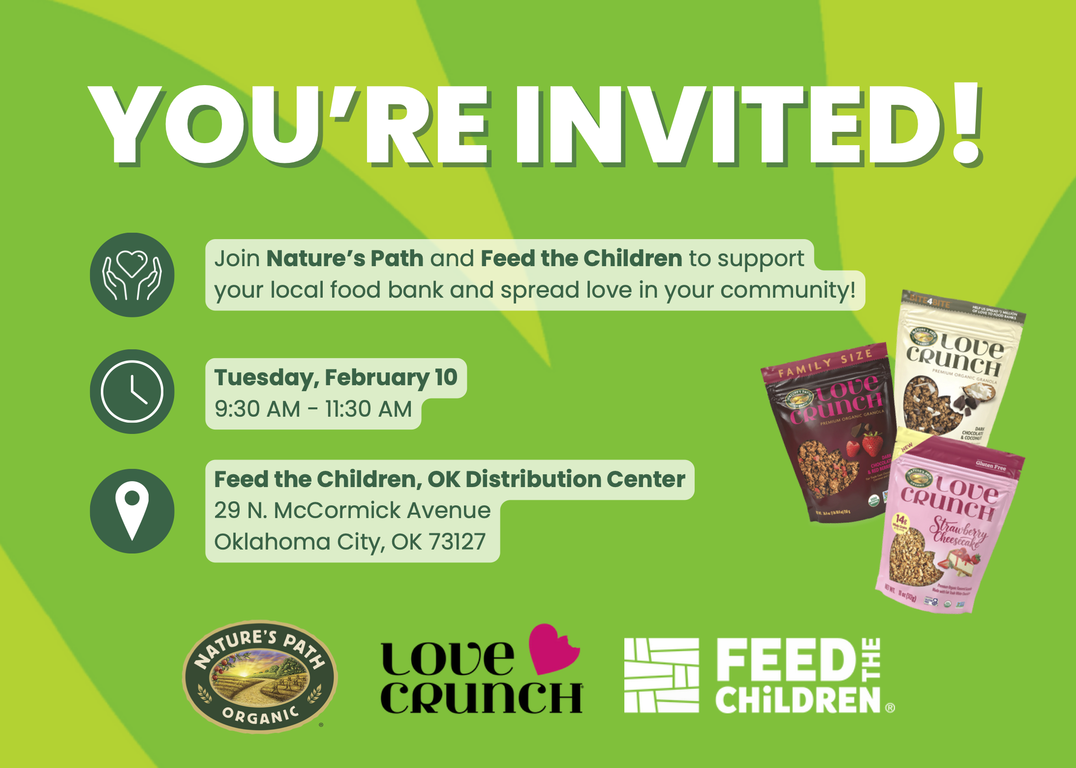 Volunteers will engage in food distribution activities, preparing boxes with food and essential items for delivery to families across the country. The event brings the Oklahoma City community together to spread love and support to families who need it most. The kickoff also marks the start of Nature’s Path Love Crunch’s “Sweet 16 Acts of Love”, a nationwide volunteer program beginning Valentine’s Week in partnership with Feed the Children and spreading love across 16 U.S. cities.