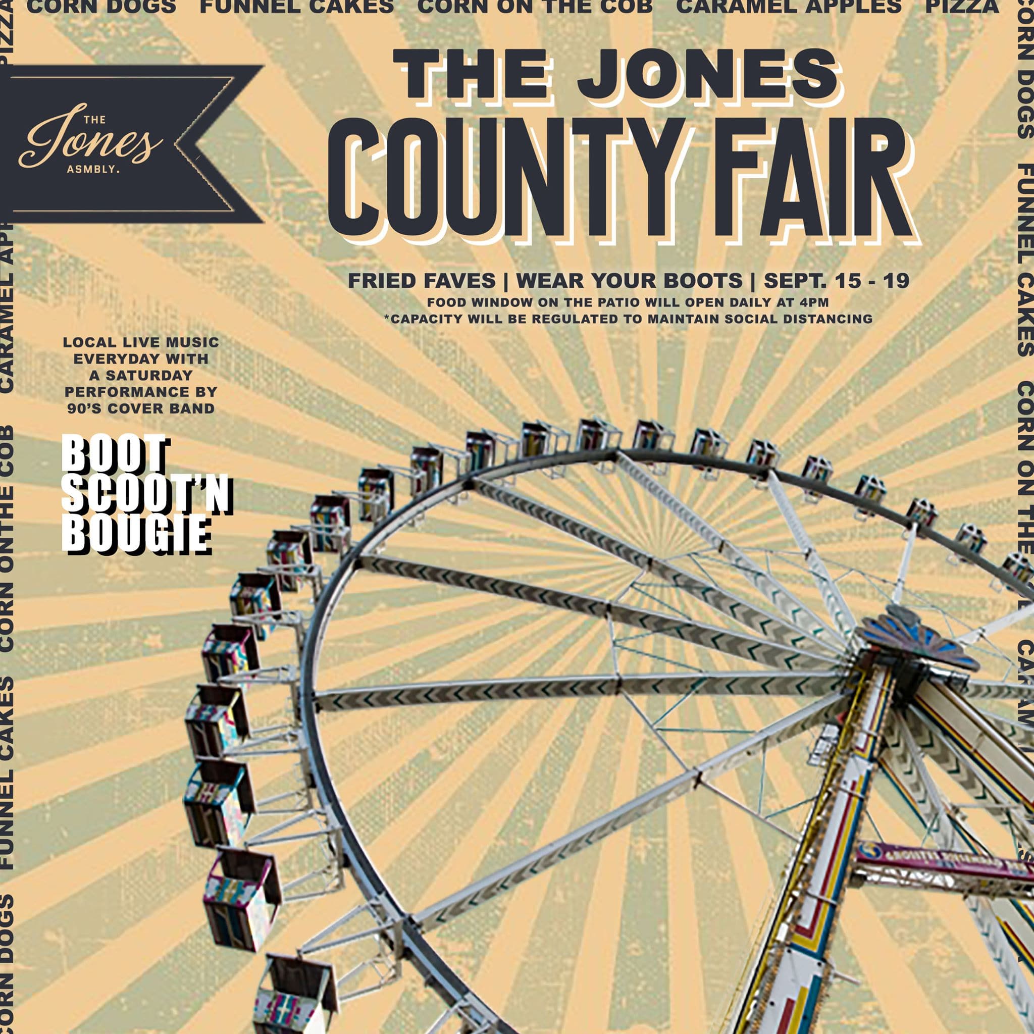 Features an socially distant, fair-themed event with live music and fair food including funnel cakes, caramel apples, corn on the cob, corn dogs and sheet pan pizza served from a patio walk-up window.