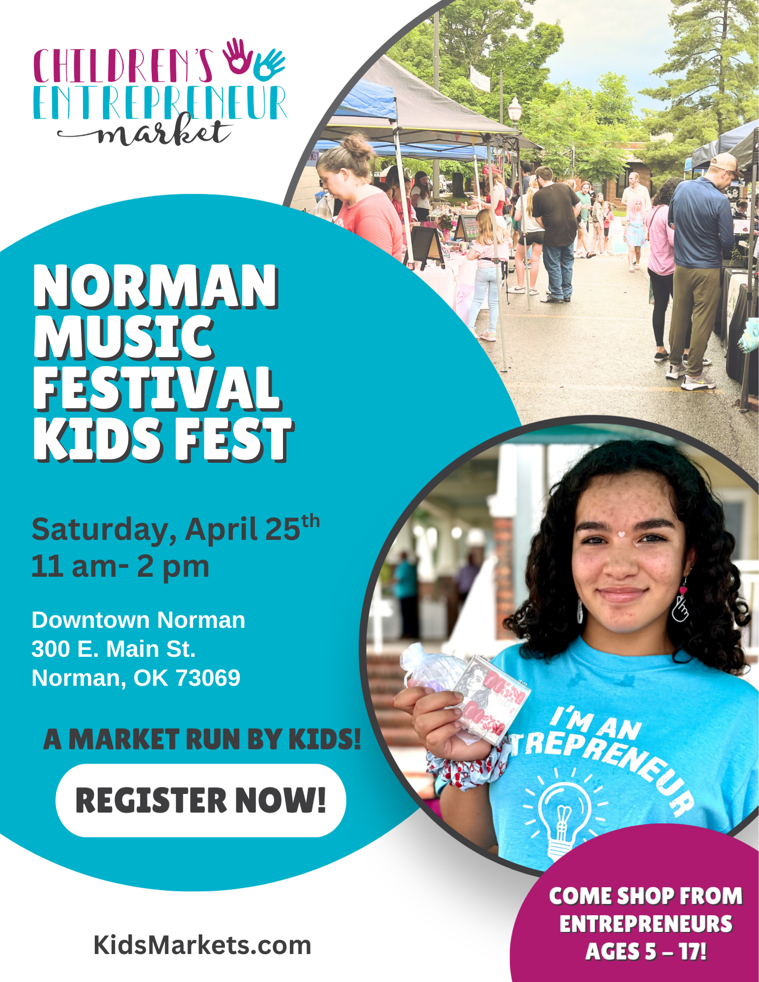 Give your child the chance to shine as a young entrepreneur at the Kids Market during the Norman Music Festival Kid Fest, one of the largest music festivals in the country! This high-energy, high-traffic event creates an exciting opportunity for kids to learn, earn, and grow while running their own mini business.