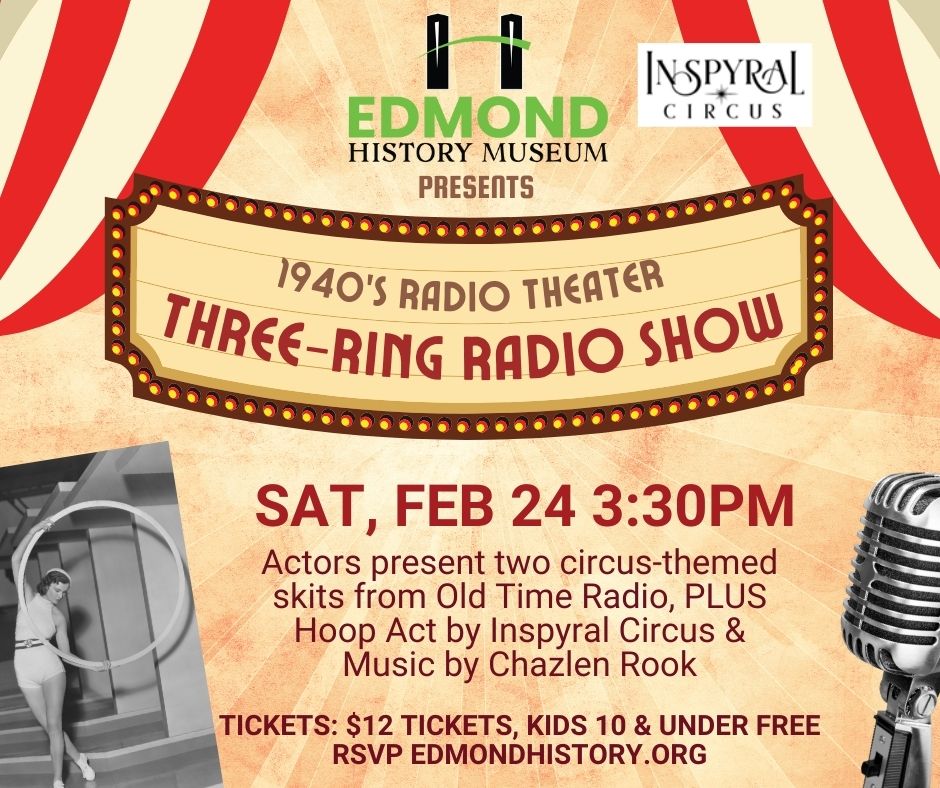 Experience the excitement of acrobats and elephants, through a live reenactment of 1940s radio show broadcasts. Edmond’s 1940s Radio Theater presents Three-Ring Circus Radio Show. The show features comedy, suspense, music and melodrama—themed around the thrill of the circus.
