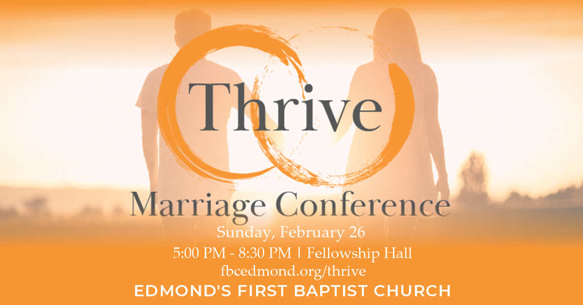 Don’t have a marriage that just survives but one that thrives. Edmond's First Baptist Church uses the Thrive Marriage Conference to give couples who are engaged, newly married or have been married for years a biblical foundation to grow or repair their marriage. Materials are written and taught by Edmond's First's Pastor, Blake Gideon.