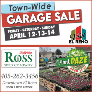 Head to El Reno for some great bargains. The City of El Reno Townwide garage Sale is April 12-14. Find a map and list of all the garage sales on the City of El Reno-Gov Facebook page. The Ross Seed Co. annual Plant Daze Sale, April 11 – 13, has $15 flats of flowers & veggies, premium hanging baskets and more bargains.