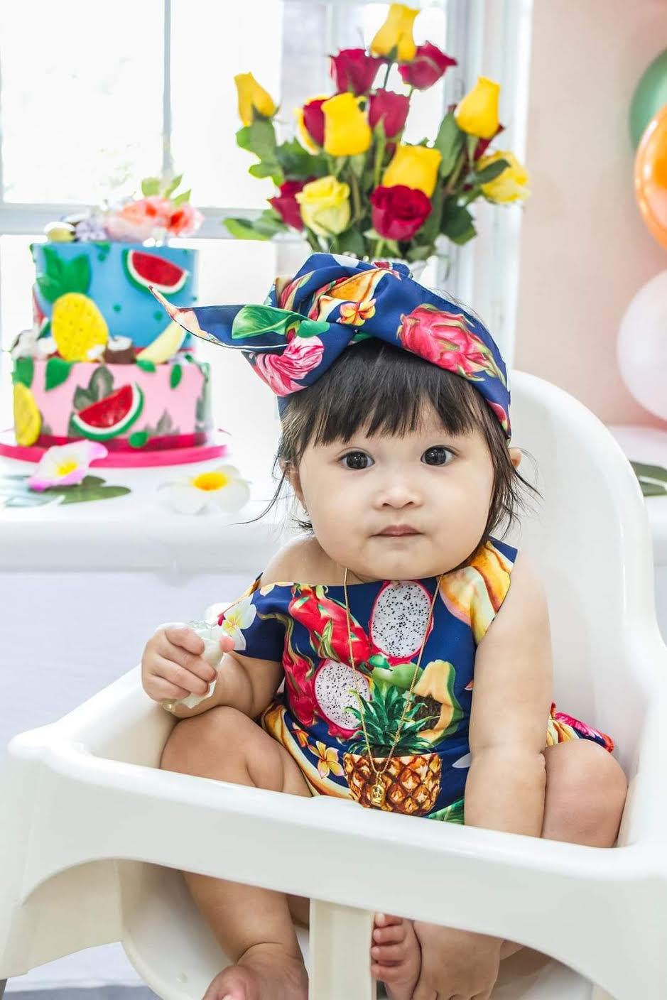 Our family focused on the small details when creating Evelyn’s birthday decorations in order to add grandeur to the pictures, which made my husband and I feel as though we were at a larger celebration. Her cake was vibrant and decorated with tropical flowers and fruits (with the theme being a nod to Evelyn’s love of devouring tropical fruits for breakfast, lunch and dinner!)