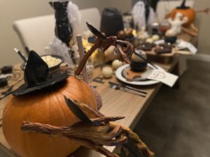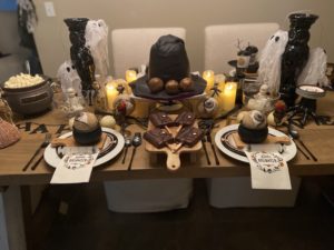 For the food, I like to layer the plates adding tiny charcuterie boards on the very top. I think it’s imperative to have something of substance to eat, so I will make, depending on the weather, tortilla soup or a big salad or pasta and serve it up on the plates with forks and knives in the shape of bones. Local professionals and folks who bake and make for fun always have interesting or unusual holiday treats. I normally incorporate one or two fun easy-to-make treats. I stick with the recipes that DON’T require a ton of materials. For instance, I made dirty q-tips using marshmallows and peanut butter. I’ve also turned juice boxes into mummies with eyes. I always check Pinterest, Facebook and Instagram for inspiration and new ideas.
