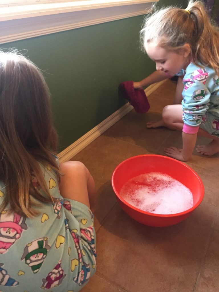 With that in mind, and since my kids are at an age where they can begin to help around the house, my ideal summer day would start with a chore list for the day. However, let me be clear, nothing at our house starts without chocolate milk and sippy cups (same as any other day). After our milk and breakfast, I would let my 6-year-old daughter read the chore(s) for the day. On this day, our chore might be something we do together like cleaning the baseboards. With a tub of soapy water and rags we would all work together to do a few rooms of the house.