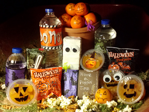 - Decorated Water Bottles: Bottles of water are a great way to dilute the flood of sugar. Jazz them up with homemade labels, ribbon, crime scene tape, or designer duct tape. You can also a wide variety of free, ready-to-print labels online by searching for “DIY Halloween water bottle labels.”