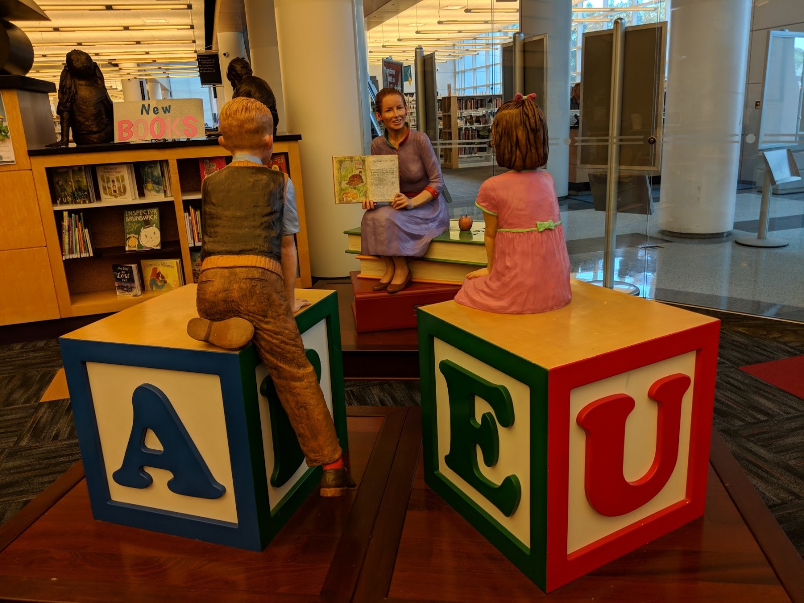 I go to the library all the time but the one we visit is closer to my house. I had never been to the one in Oklahoma City where there are tall buildings before until my baby shark went to a stuffed animal sleepover party there last summer but I got to go back after and see the library.