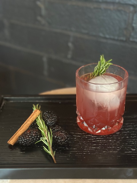 Instructions: Muddle 3-4 blackberries and one sprig of fresh rosemary in a mixing tin or glass. Add the pomegranate juice, cranberry juice, cinnamon syrup and lime and then shake (or stir) well. Strain the drink with a fine mesh strainer into a medium-sized glass over ice. Fill with Ginger Ale (I like the Ollipop brand) and garnish with a sprig of rosemary.
