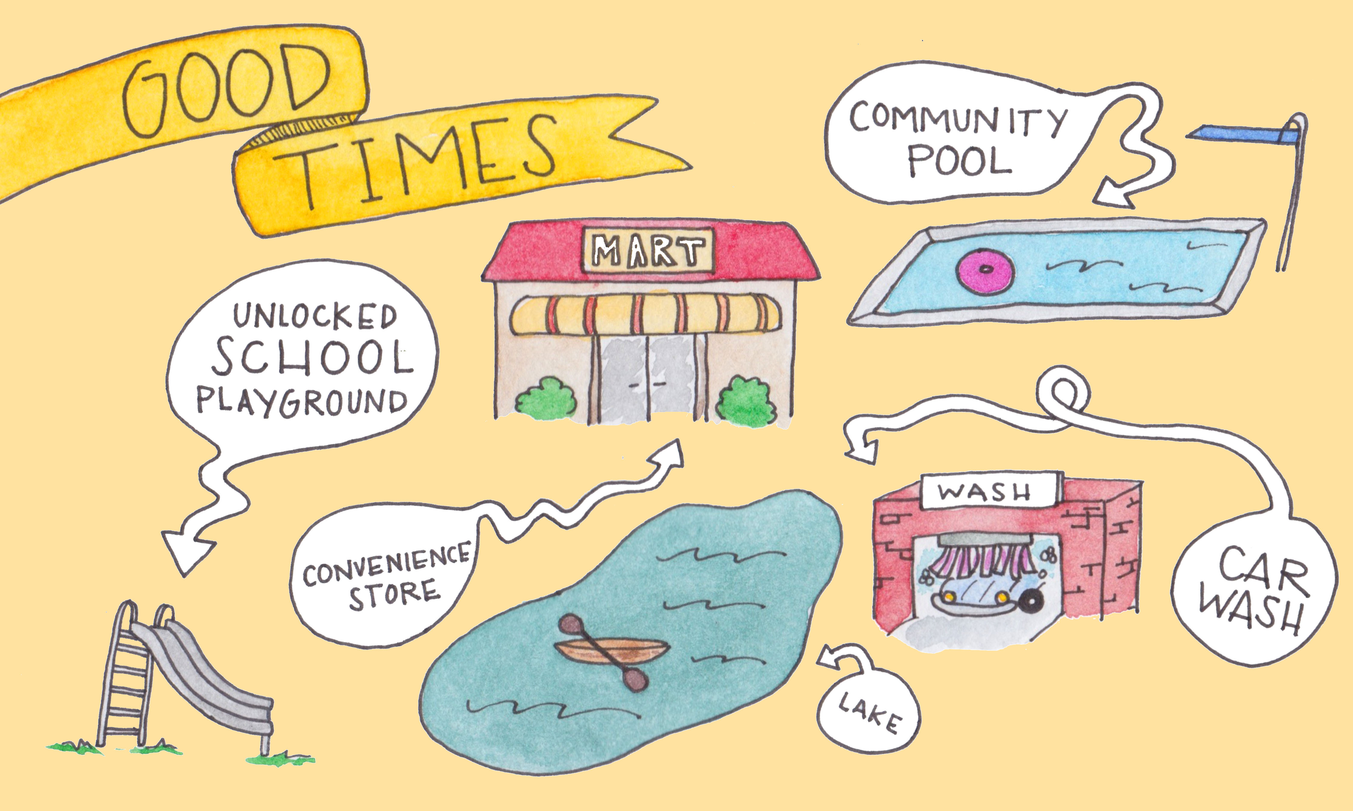 We do not live in the neighborhood of my childhood, and it’s changed quite a bit, so I knew their experiences wouldn’t be the same. But, we were close to a Walmart and there was a private pool we could sneak into with some friends who were members on their open swim days.