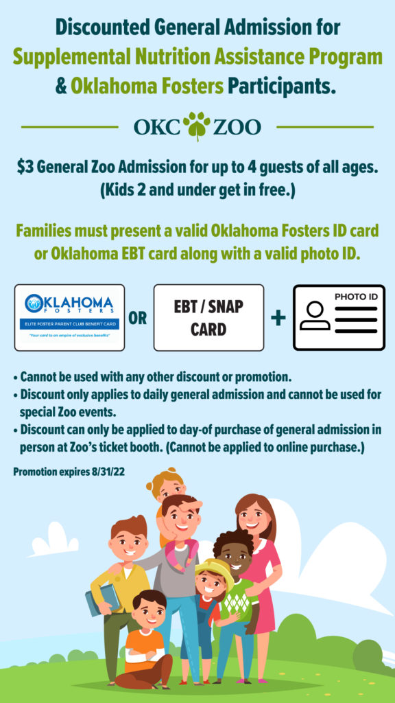This discount offer applies to daily general admission to the OKC Zoo for Oklahoma foster families and SNAP program participants and ends Wednesday, August 31, 2022. Participants must show their Oklahoma Foster Parent Exclusive Benefits card or Oklahoma EBT care plus a valid photo ID card at the OKC Zoo’s ticket window upon arrival to receive discounted general Zoo admission of $3 per person. This discount is limited to in-person ticket purchases only – not online purchases – and must be used only on the day of purchase. Discount is limited to four (4) total guests per day, per cardholder. Children two and under are always admitted free. Additional Zoo discounts and coupon vouchers cannot be combined with this offer.
