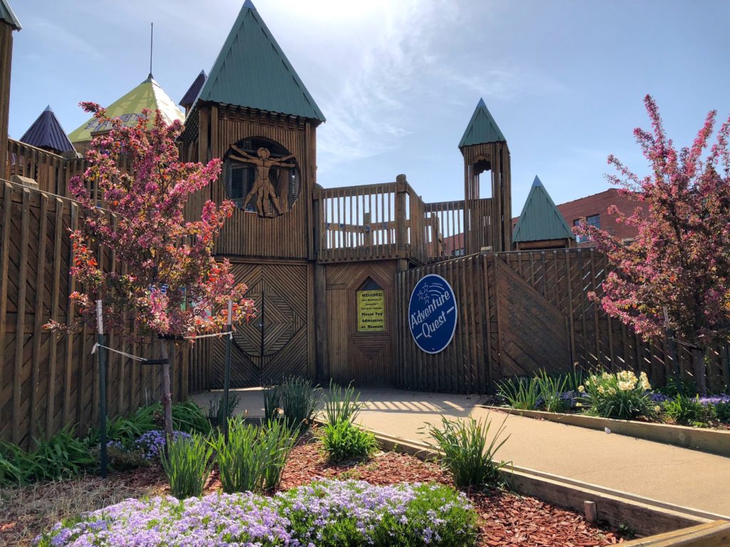 With the help of 12,000 volunteers, one year later, Leonardo’s opened Adventure Quest, an outdoor science playground. The three-story wooden castle includes bridges, slides, swings, mazes, a water table, dinosaur dig and Tot Lot. It is the world’s largest community-built outdoor playground.
