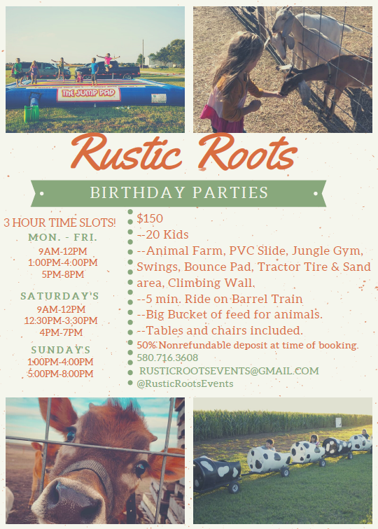 Celebrate your next big day on the farm at Rustic Roots! Rustic Roots' parties include access to farm attractions such as a climbing wall, bounce pad, animal farm, PVC slide, barrel train and more for up to 20 kids. Rates start at $150 for 3-hour time slots and include tables, chairs and a big bucket of feed for animals.