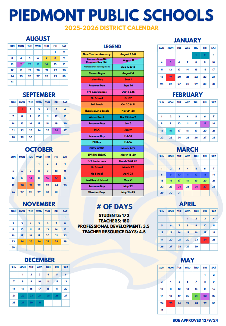 Key dates for the Piedmont Public Schools District 2025/2026 school year: