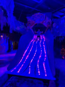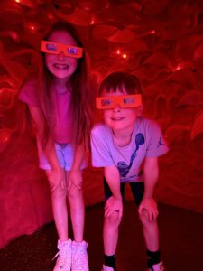 We jumped at the chance for a preview of Factory Obscura’s brand new experience, “Cosmic Callback: An Illuminated Interlude,” and the word that kept coming to mind as we watched art come to life was: magical! This mesmerizing light and sound show represents the journey to the heart of a star and back again. Created by a collaborative team of 10 artists, the experience lasts about 15 minutes and is enjoyed from some cool, comfy chairs (also art!), allowing you to gaze up through 3D glasses at swirling lights punctuated by a soundtrack. (My youngest