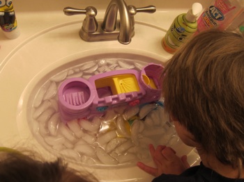My son also had his own rabbit trail last week, which started with some bathtub toys.  For some reason he had Atlantis on the brain.  I’d like to say it was definitely from the reading he’d done about Plato, but it also very likely could have been from Atlantis SquarePantis.  Anyway, he decided to put a plastic castle of his sister’s in one of the bathroom sinks and pretend like it was Atlantis.  After playing around a while, he yelled, “What would happen if Atlantis froze?!”  Pretty soon I heard him running down the stairs, shortly followed by the rumble of the ice dispenser.  He found a thermometer and his sister became the ice courier as he worked to see how low he could bring the water temperature.  Eventually he got it to 18 degrees!  “Filling the bathroom sink with ice cubes and toys” was not anywhere in the day’s lesson plans, but he learned a lot from his experiment.  We reviewed reading a thermometer and the difference between Celsius and Fahrenheit and talked about how it felt like the water at the Titanic museum we visited over the summer.  He wondered if it would be possible to get the water completely frozen and we talked about how we would be in really bad shape if our house got cold enough for that to happen!