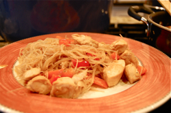 - In a wok or large skillet, heat olive oil and cook chicken. About 10 minutes. While chicken is cooking, break rice noodles in half into a large bowl. Pour hot water over noodles to soften.