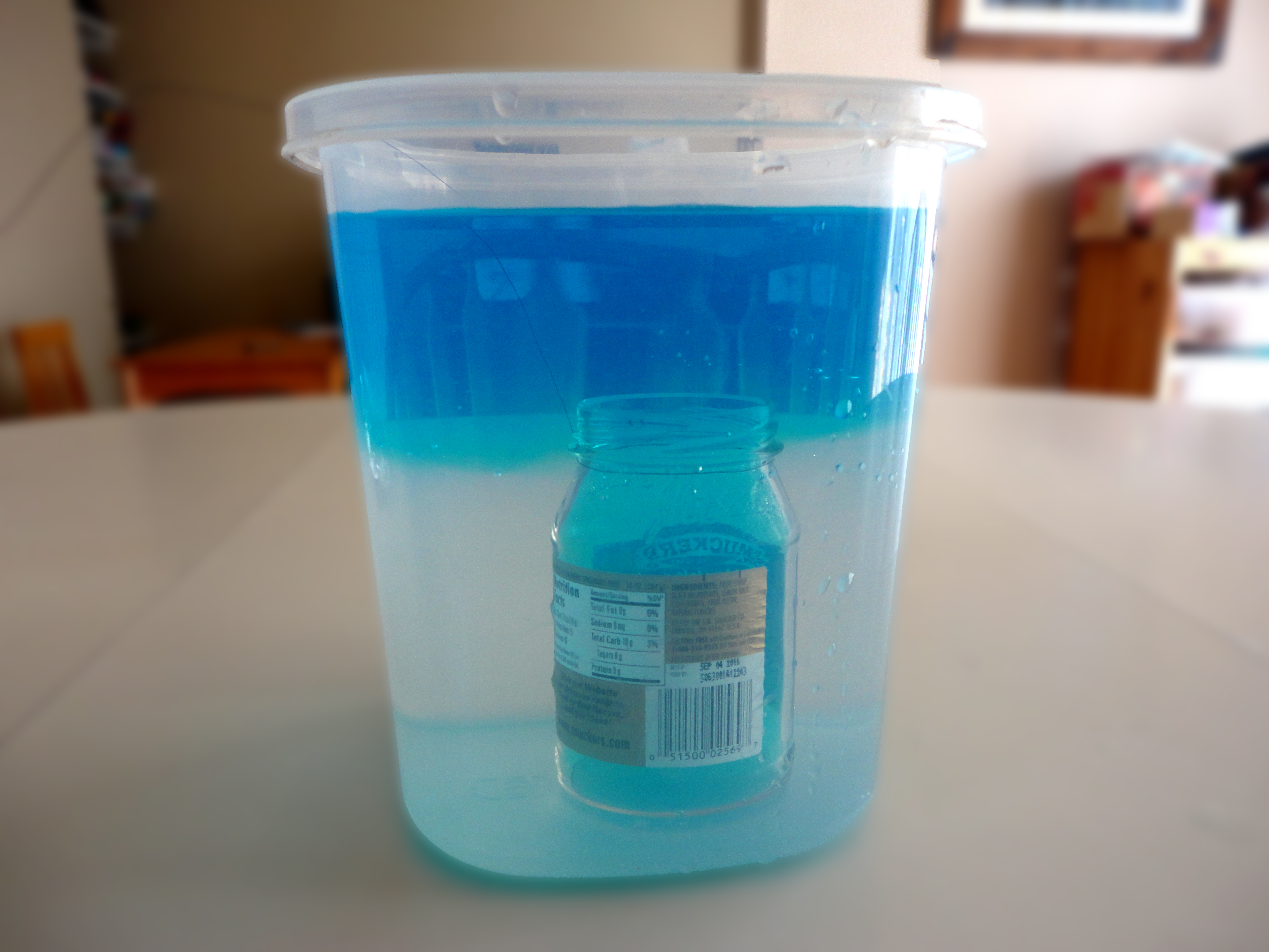 • A tall and wide clear glass or clear plastic container, a small jar (get a jar with a small neck if you can), string/thin wire, water, food coloring